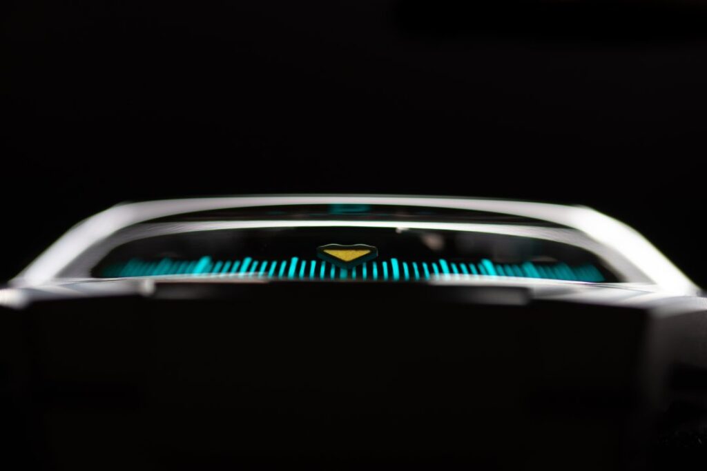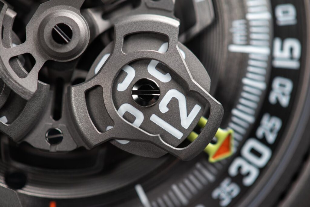 After the black of carbon and the muted grey of raw titanium, URWERK continues to explore these ‘cold’ colours that come to life under the light and enlighten the informed eye. More than just work on colour, the new UR-100V Magic T is about research into nuances, reflections, and chromatic subtleties. It features a luminous and intense metallic grey, now delicately nestled on the wrist. From case to bracelet, this UR-100V Magic T is all about titanium and pure magic