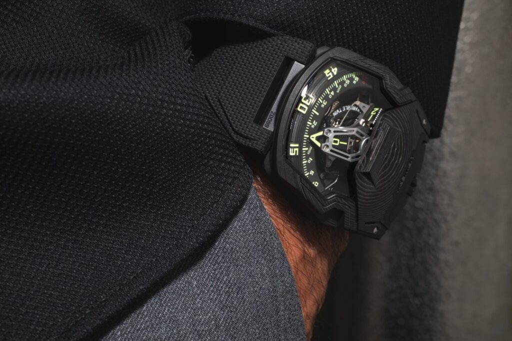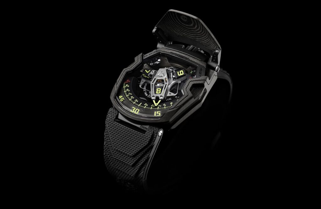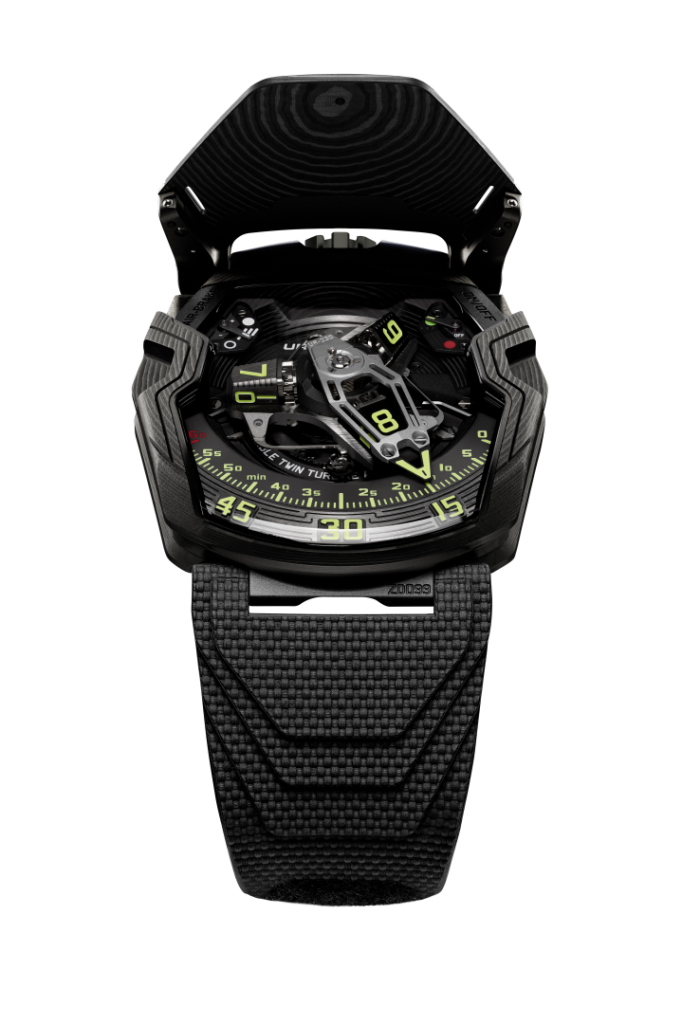 Black, light and rigid, this carbon is machined in superimposed layers, pressure-bonded at high temperatures. The resulting block is then worked into the mass, following a pattern that reveals the layers in a regular, controlled geometric pattern. The back is made of grooved and perfectly dermo-compatible black DLC titanium. Inside the case, the UR-230 ‘Eagle’ encloses its UR-7.30 calibre in a hermetically sealed container resembling a strongbox.