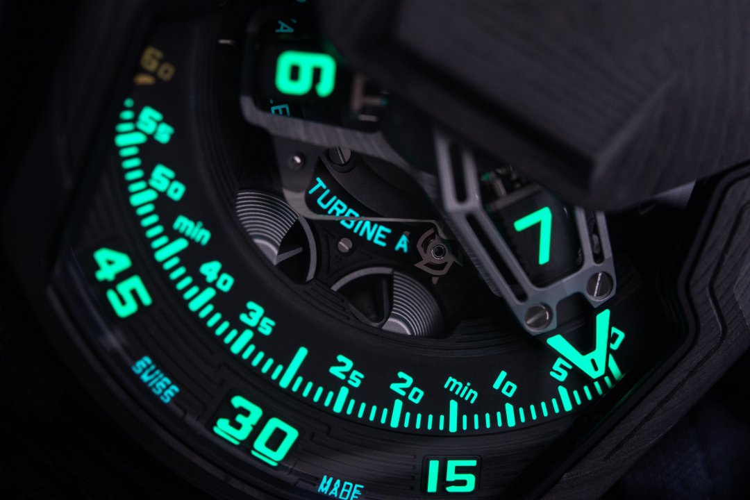 – SuperLuminova components: yellow glowing yellow for the hour transporters and hour-markers; white glowing blue for power reserves; green glowing green, red glowing green for the 60-minute marker and the end of the power-reserve scale.