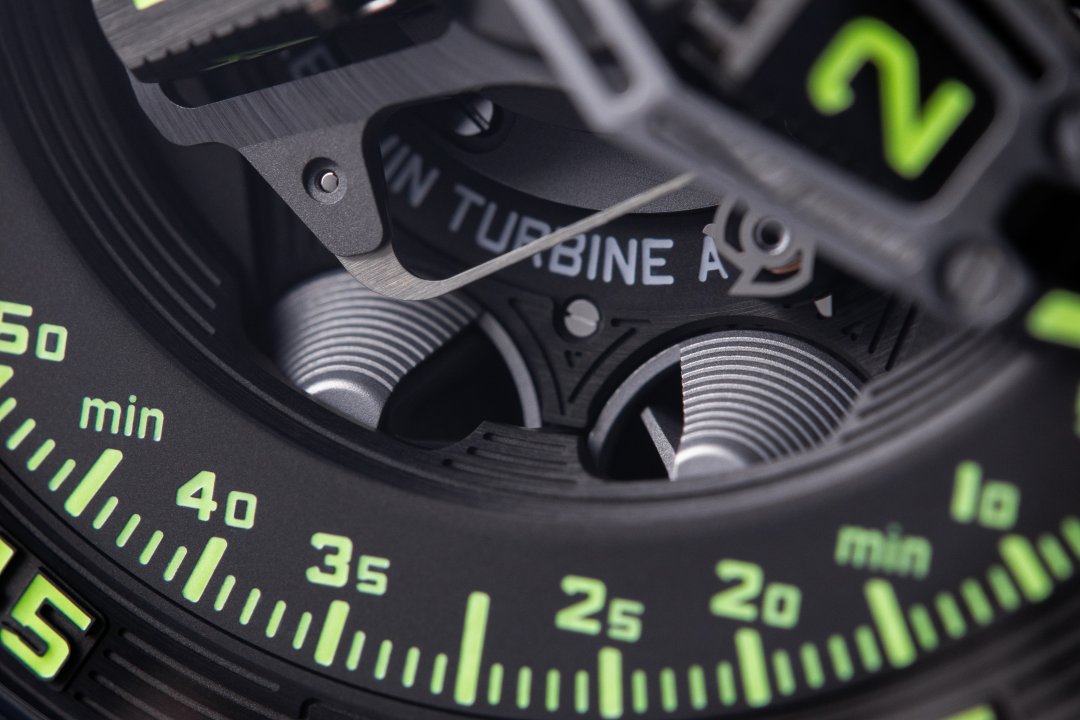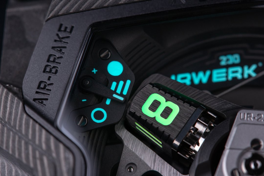 In addition to this time display, the UR-230 “Eagle” showcases new functions. URWERK has developed a world-first set of shock absorbers designed to protect the new UR-7.30 calibre via turbines. A first set of turbines is dedicated to attenuating the impact of any external shock, thereby guaranteeing the robustness and durability of the watch. A second set controls the flow of air that feeds the winding system. The strength of this “air brake”, designed to modulate the winding power according to the wearer’s level of activity, is set by a rotating knob on the back of the watch.