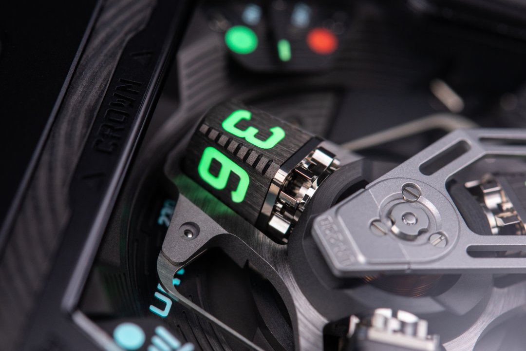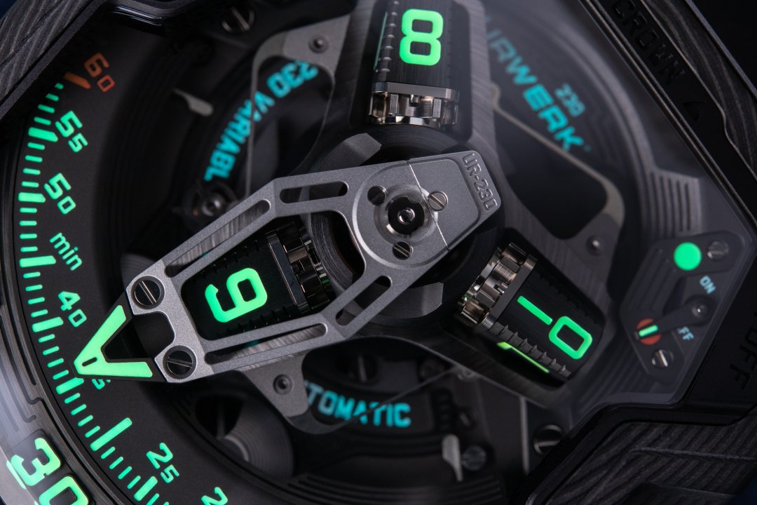 The new UR-230 ‘Eagle’ retains the display concept of the UR-220. It is a sophisticated version of the revolving satellite complication that is URWERK’s essential signature. On a three-armed carrousel, rotating blocks each carry four hours’ numerals. They scroll along a 120-degree sector, with the face of the current hour pointing towards the observer. To display the minutes, these display cubes are embedded in an aluminium 3D retrograde hand. At the end of its 60-minute journey, this skeletonised hand returns to index 0, where it takes charge of the cube displaying the next hour.
