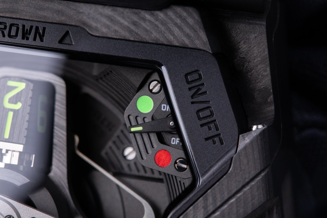 A second switch opposite the first serves to entirely disengage the rotor. The UR-230 ‘Eagle’ then switches to manual winding mode. The level of adjustment of these two functions is indicated by two symmetrical indicators at 11 and 1 o’clock on the CTP carbon cover.